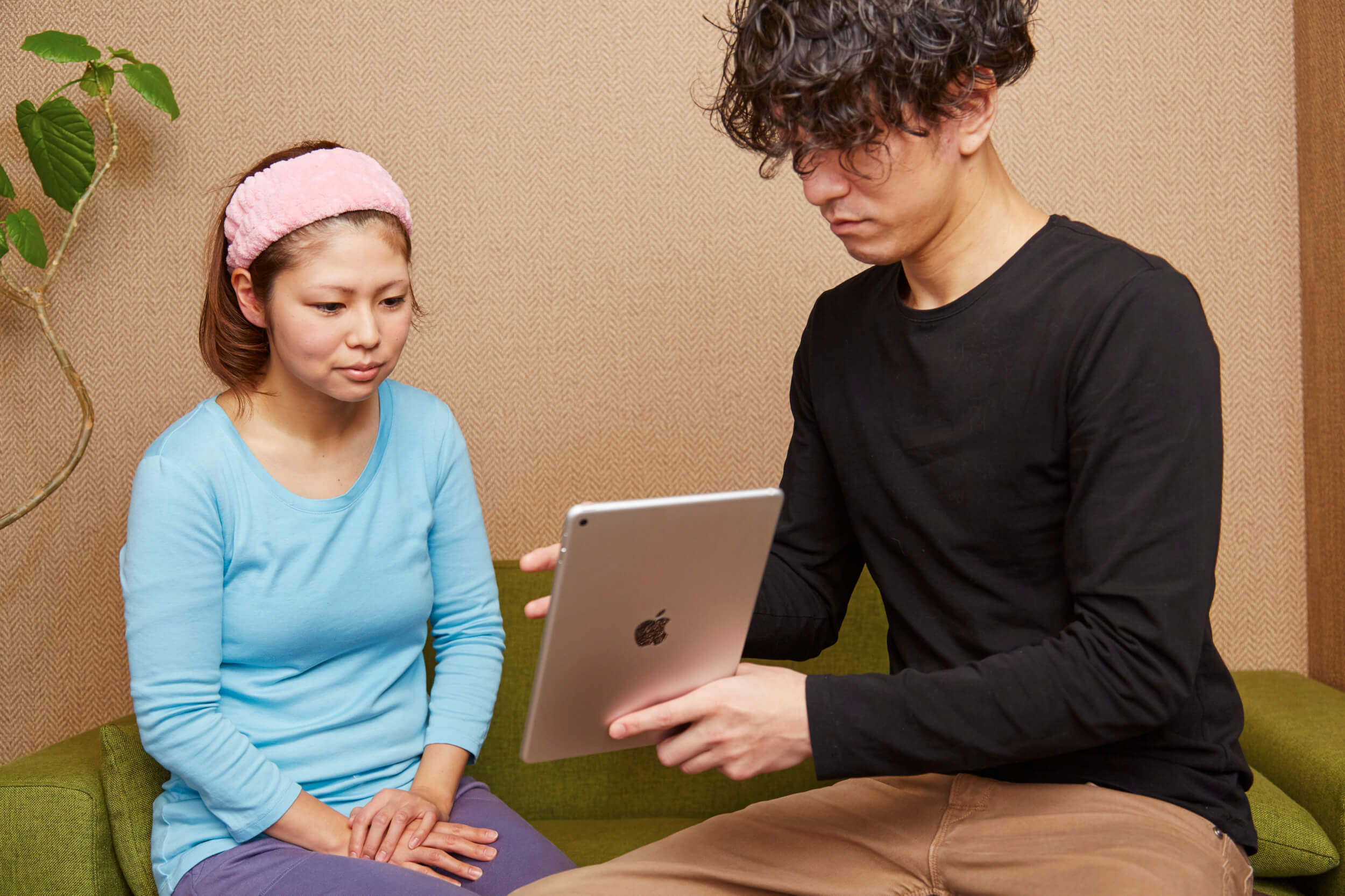まずは肩こりや腰痛、むくみなど、顔や身体にどんな悩みがあるかをカウンセリング。