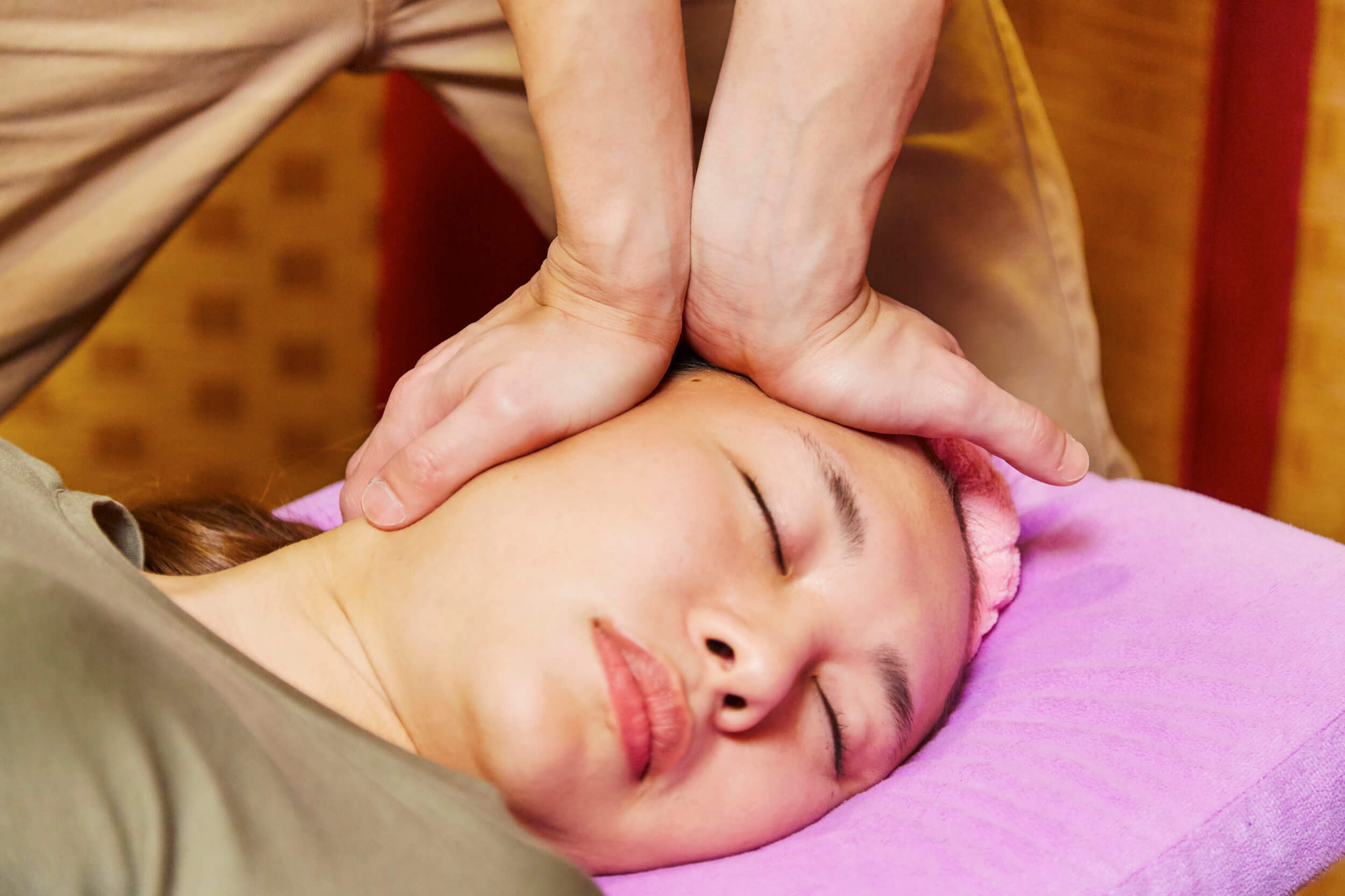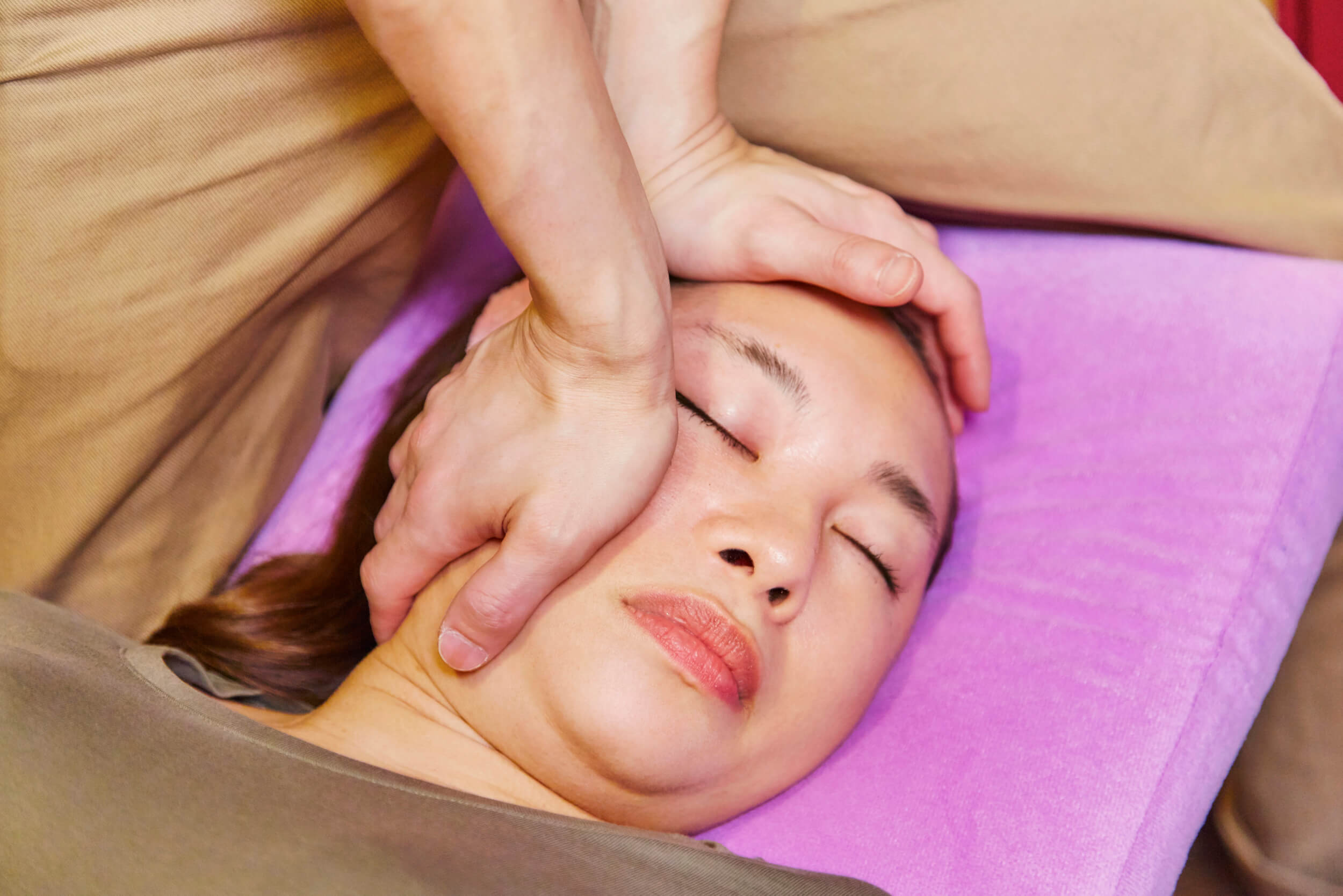 通常の小顔矯正とは違い、EMS(低周波)のグローブを使って表情筋を動かして施術。 23枚の頭蓋骨のうち、中心部にある6枚の骨をメインに矯正し、顔をシンメトリーに近づけてくれます。