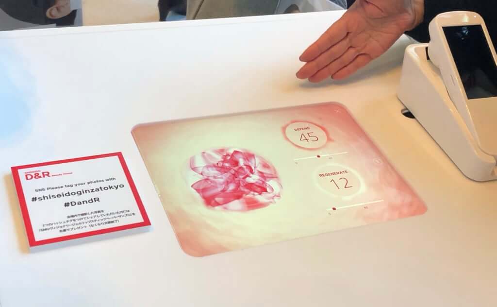 顔の4箇所をスキャンして2つの素質、「DEFEND(ディフェンド/守り抜く)」と「REGENERATE(リジェネレイト/引き出す)」の数値を測定。どちらも50を平均値とし、65以上だと良好状態とのこと。測定後、数値の左側に肌の状態を表したイメージモニュメントが出現します。