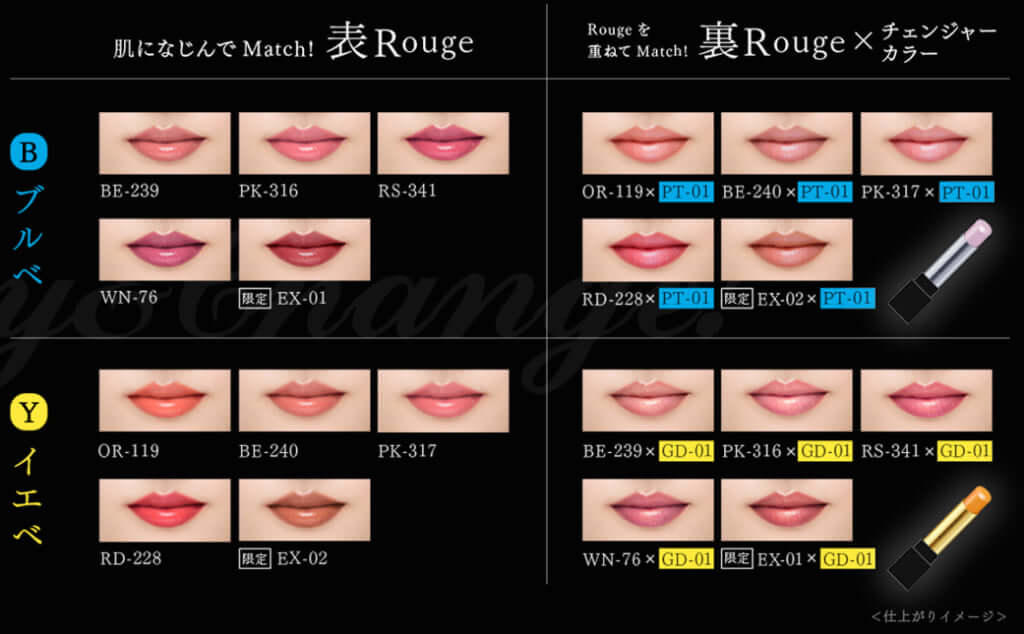 例えば、ブルベ肌の人が“裏ルージュ”(イエベ肌の人には “表ルージュ”)を使いたいときは、「プラチナチェンジャー」を重ね塗り。「チェンジャーカラー」を重ねることで“裏ルージュ”を自分のスキンカラーに合うようにカスタマイズができるんです! 逆に、イエベ肌の人が“裏ルージュ”を使いたいときは「ゴールドチェンジャー」を重ねてみて。これで “裏ルージュ”が一瞬にして自分の肌になじむ色に♡