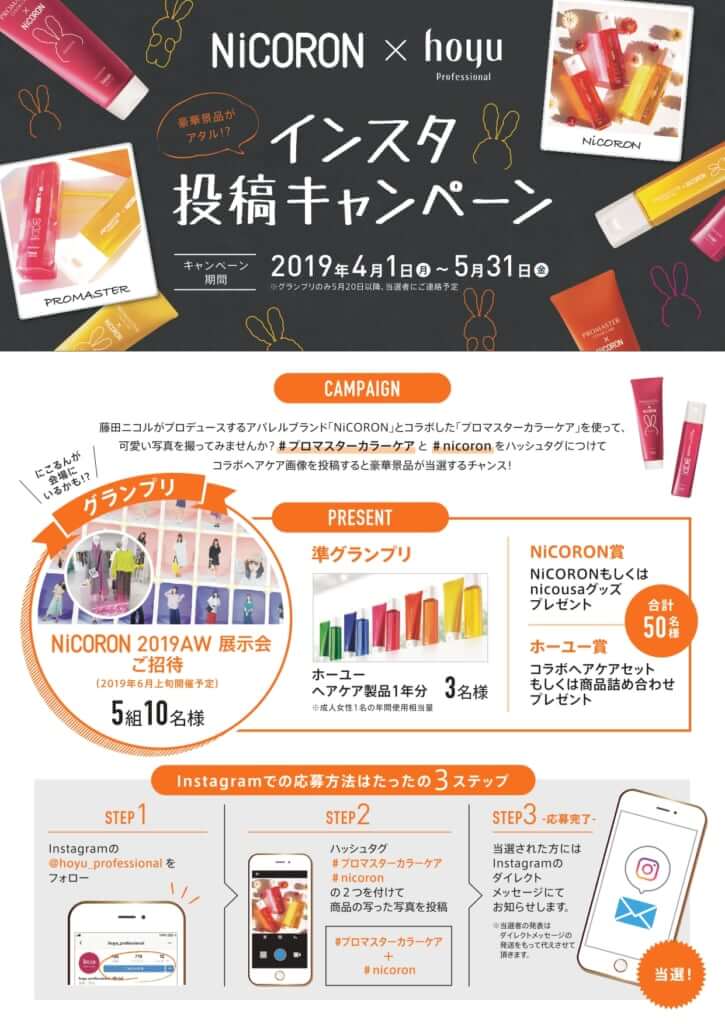 発売を記念してインスタで豪華なキャンペーンが開催中!「#プロマスターカラーケア」「#nicoron」のハッシュタグをつけて、コラボヘアケア画像を投稿すると「NiCORON」の最新ファッションコレクションや、ヘアケア商品1年分などの豪華景品が当選するチャンスが♡