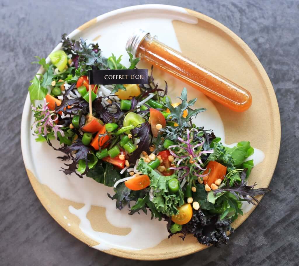 テーマの”酷暑BEAUTY”を象徴する、酷暑を乗り切るための食べるサプリサラダ。美肌効果や身体を整えるうれしい効能があるインゲンやビーツ、ミネラルたっぷりな葉物野菜などをチョイスした贅沢な一皿! 緑豆の春雨とハトムギもプラスし食感にもこだわっています。仕上げに、酵素たっぷりのドレッシングをかければ、美腸効果も期待大♡