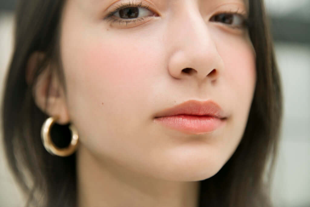 フレッシュメイクのポイントは「引き算」。ポイントメイクの主役を決めたら、それ以外は徹底的にメイク感を抑えるとカジュアルな仕上がりになります。ここではチークと口紅を主役にして、目もとは控えめに。