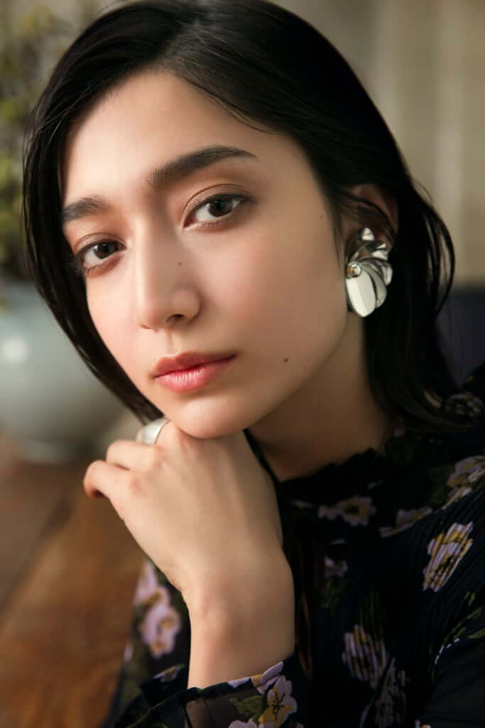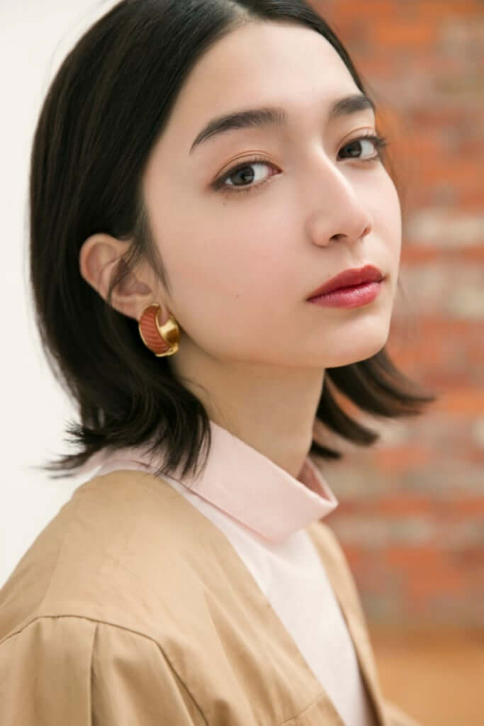 博物館や美術館など文化的なスポットを巡る日には、凛とした眼差しと少しくすんだレッドリップで大人っぽい知的な雰囲気に。