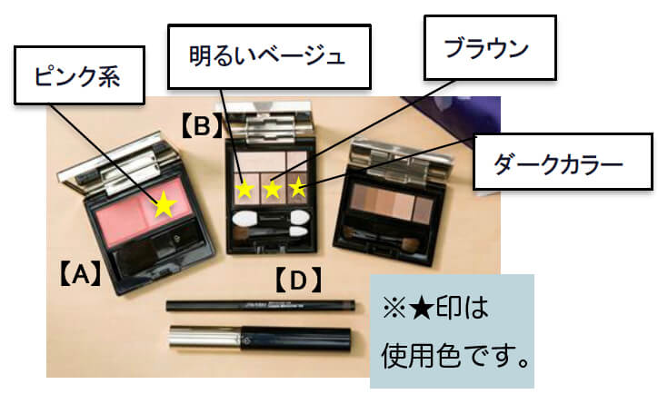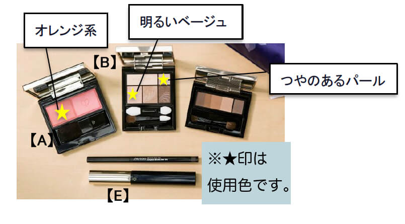 今回、ポイントメイクはパウダータイプのアイブロウ、ベージュ系のアイシャドウ、ブラウンのアイライナー、マスカラ、チーク(ピンク系とオレンジ系の2色入り)、持ち運びに便利なミニサイズのリップ2品(レッドとオレンジ)のみを使用して3つのメイクパターンをご紹介。