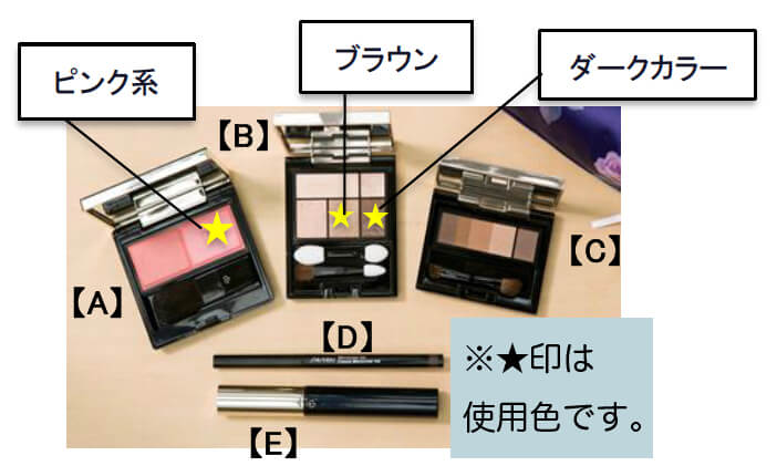 (3) マスカラ【E】は上下まつ毛にたっぷりとつけて、アイラインは使用しないと抜け感が出ます。