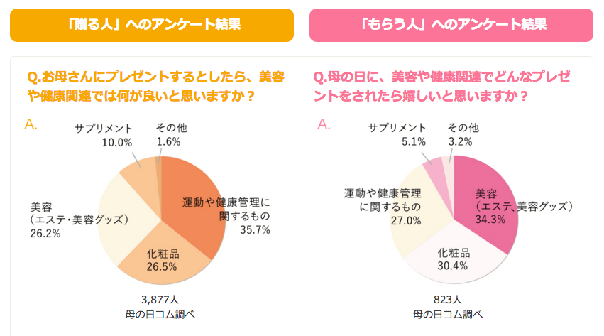 母の日にほしい美容や健康グッズに関するアンケートでは、プレゼントする側の「贈りたいギフト」トップは運動や健康に関するものでした。でも、実際に貰うお母さんが「もらいたいギフト」のトップは「エステ・美容グッズ」。続いて、「化粧品」、「運動や健康管理に関するもの」…という順番だったんです。