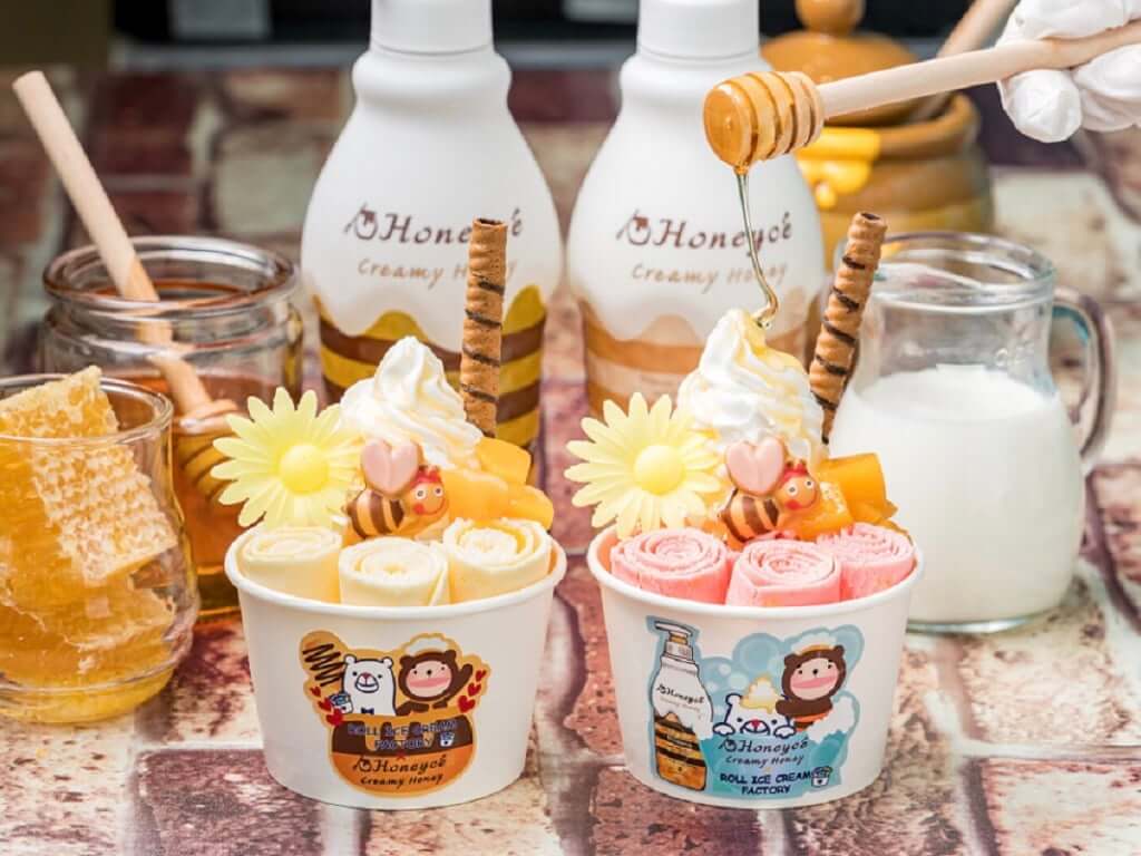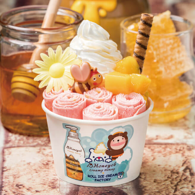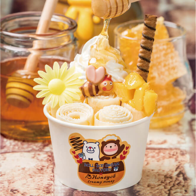 フルリニューアルを記念して7/15(月・祝)までの期間限定で「ロールアイスクリームファクトリー」とコラボ開催中! 「ハニーチェ」のブランドカラーである黄色をテーマにした「クリーミーハニーマンゴー」と、店舗人気No,1のストロベリーと合わせた「クリーミーハニーストロベリー」の2種類を販売中。ハチミツはかけ放題だから自由にたっぷりとかけて、「 #食べるハニーチェ」を楽しんで♡