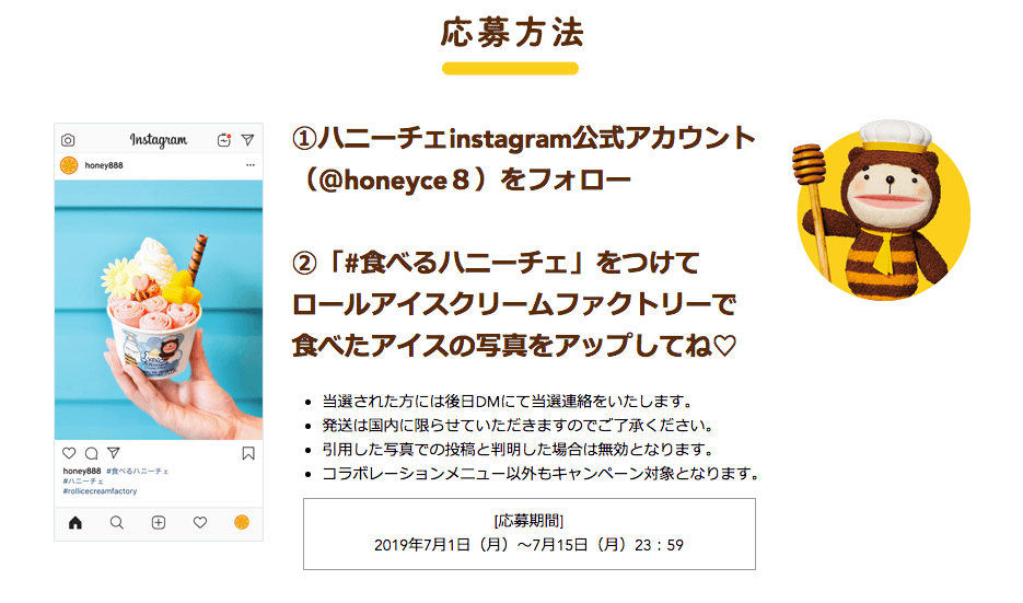 「Honeyce’」の公式Instagramアカウントをフォロー&コラボアイスクリーム写真と「#食べるハニーチェ」をつけてUPすると、抽選で10名様にハニーチェセットをプレゼントするキャンペーンも開催中!