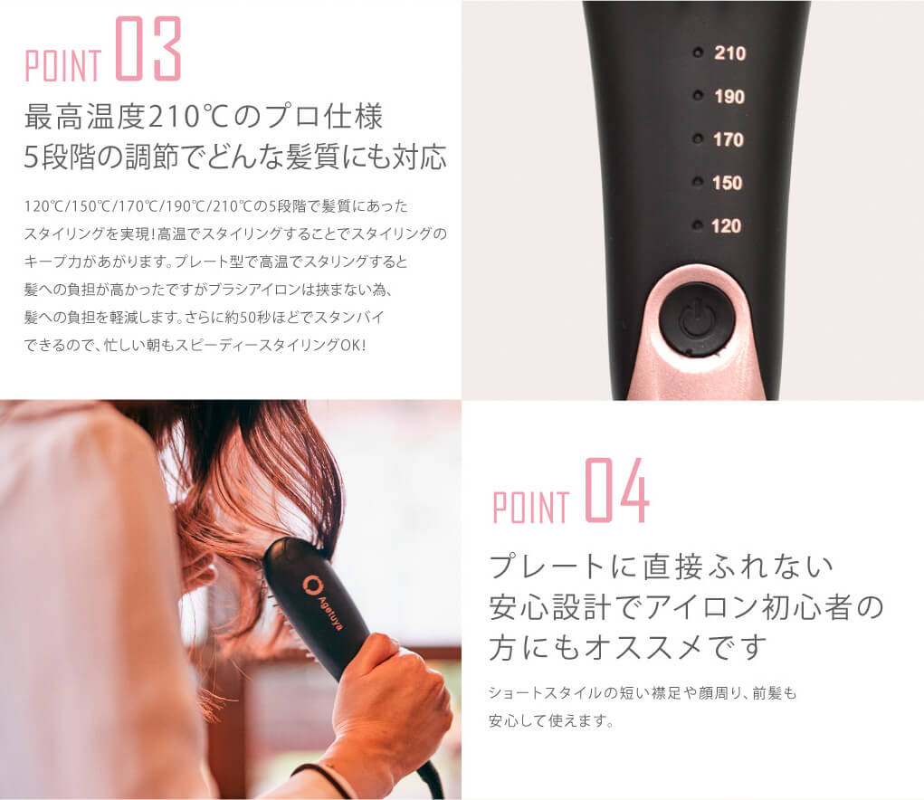 また、本体の機能面も頼もしく、最高温度は210℃という本格派! 5段階に温度切り替えが可能だからスタイルに応じた設定ができちゃう♪ プレート自体には直接触れない設計で、コテでは難しい前髪やえりあし、ショートヘアにも安心して使えちゃいます。