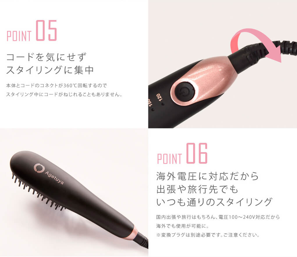 360度回転するコードがブローの邪魔をしない点や、海外電圧にも対応しているので旅行先でも手軽にスタイリングできちゃうのもうれしいポイント。こういうかゆいところに手が届く感じがGOOD♪