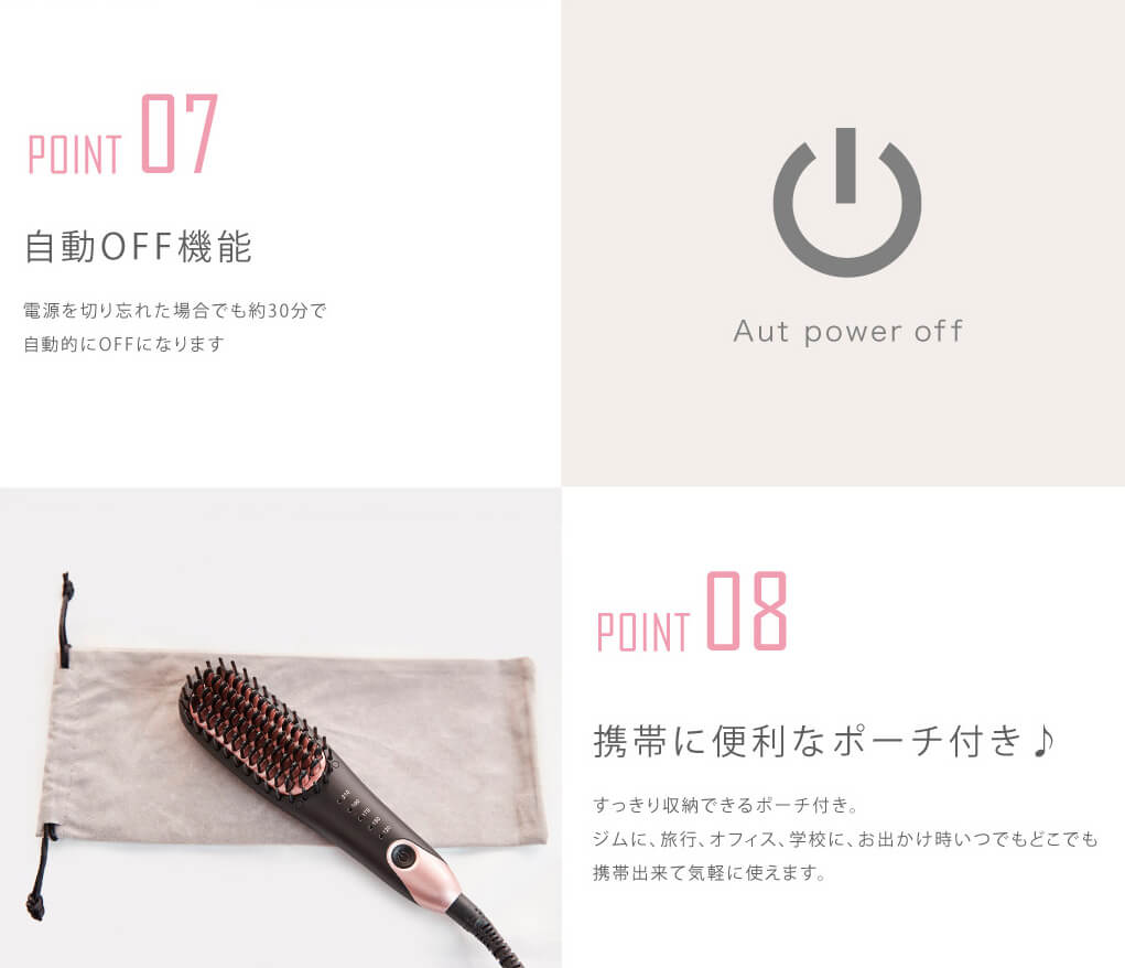 ヘアアイロンの電源をうっかりオンにしたままにしてヒヤッとしたこと、きっと誰しも一度はありますよね? 「アゲツヤミニブラシ」は約30分で自動オフになるという優秀さ! そして付属品にはスッキリ収納できるポーチも。スタイルのお直しも手軽に出来て、コンパクトなつくりだからお出かけにも持って行ってくださいね♡