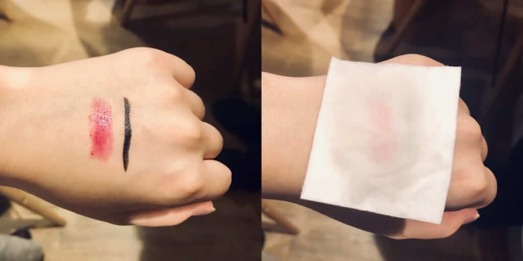 まったく“こすらずに”スッとふき取ると、リップはキレイに落ちました! 全然力を入れていないのに驚き。アイライナーは少し残っちゃいましたが、もう少しコットンを馴染ませる時間を長くするとすっきりキレイに落ちべたつきもありません♡ クレンジングオイルを使ってのメイク落としよりも力んでいないのに、この落ちっぷりには感動!