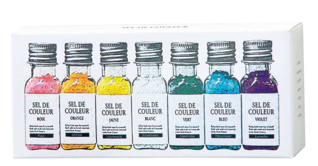 「SEL DE COULEUR」はフランス・ブルターニュ産の自然塩に天然エッセンシャルオイルや植物エキス(うるおい成分)を配合したバスソルト。それぞれ色と香りが異なった7種がセットとなっています。いろんな香りや湯色のバラエティを楽しめるから、プチギフトとしても喜んでもらえますよ。