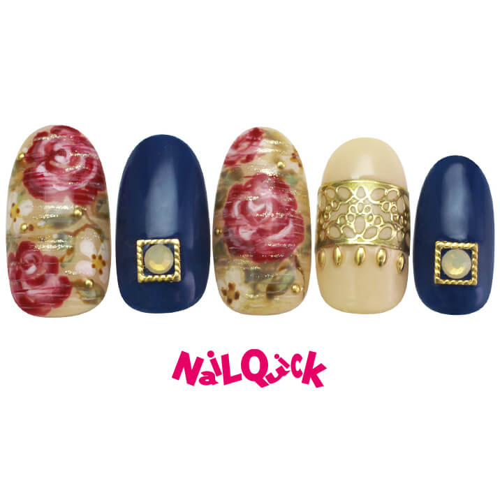 アビスカラーとアンティーク調のゴブラン織りのローズで甘辛ミックスネイル。