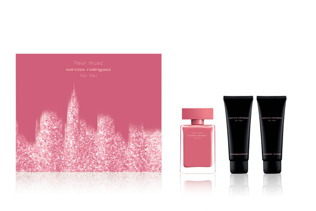 セット内容:ナルシソ ロドリゲス フォーハー フルール ムスク オードパルファム(50mL)、ナルシソ ロドリゲス フォー ハー ボディローション、同シャワージェル(各75mL)