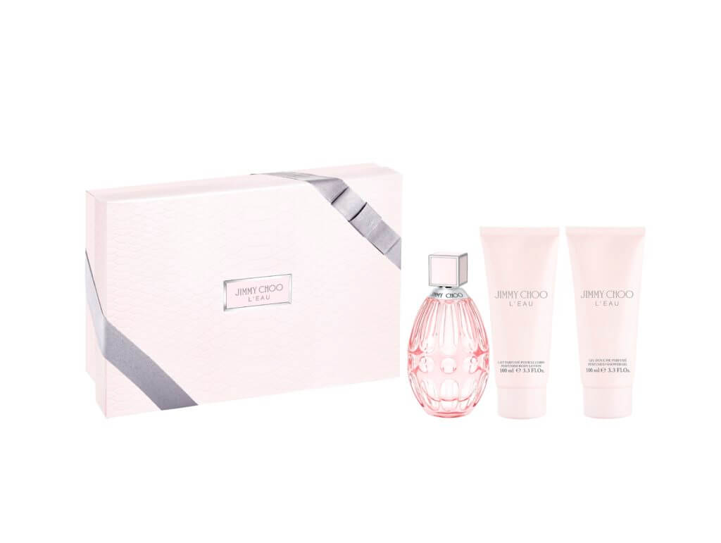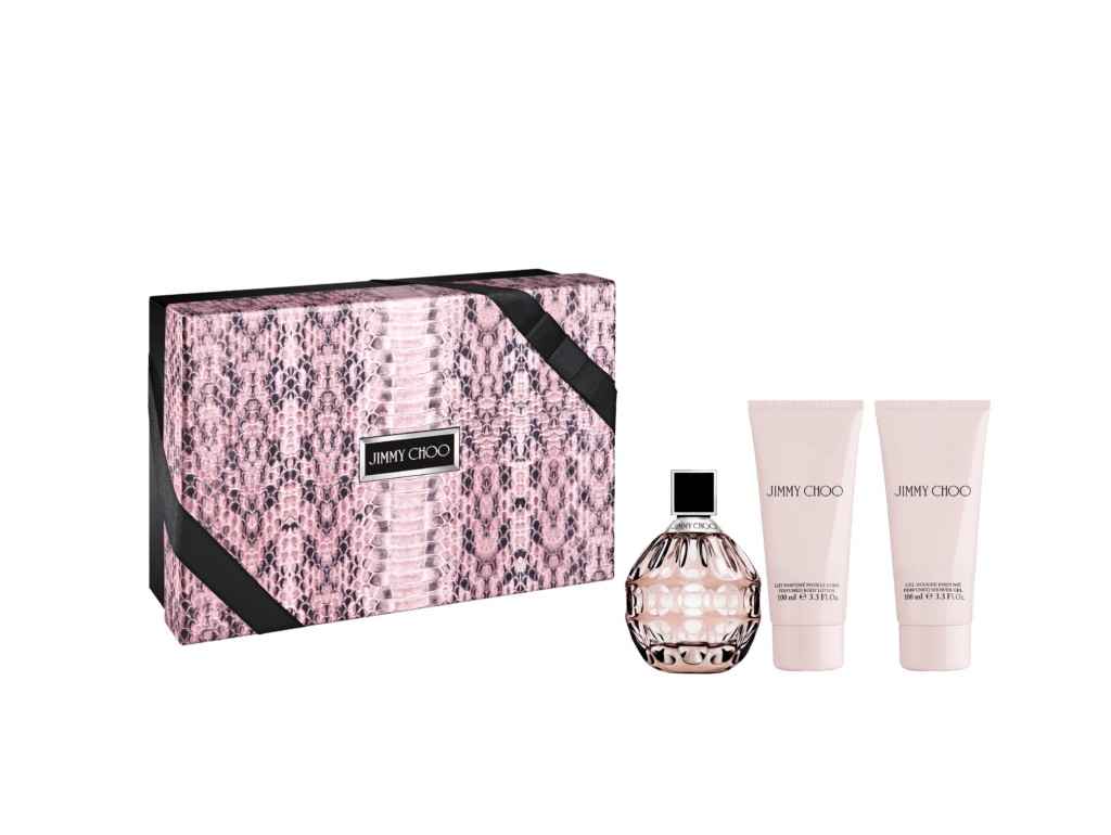 セット内容:ジミー チュウ オードパルファム(100mL)、同ボディローション(100mL)、同シャワージェル(100mL)