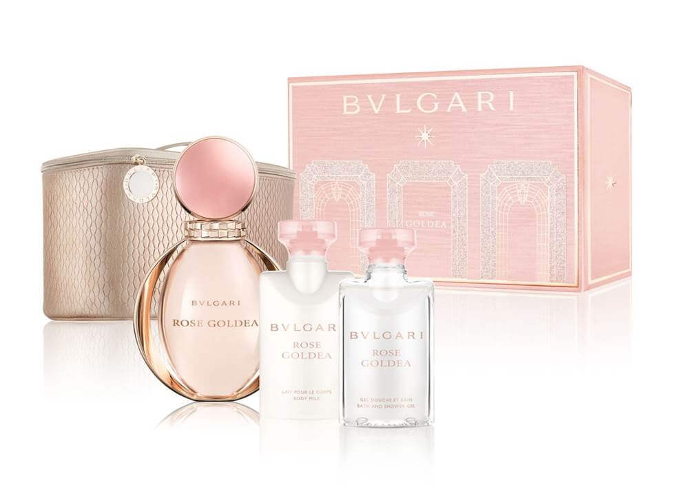 セット内容:ブルガリ ローズ ゴルデア オードパルファム(90mL)、同ボディミルク(75mL)、同バス&シャワージェル(75mL)、ポーチ