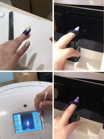 次に、爪周りの皮膚にマスキングをして、機械に入れ細かい調整をしてからプリントします。