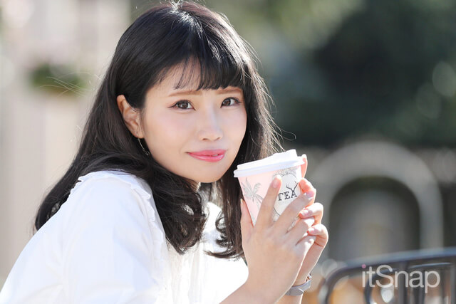 32mmのコテで中間から落とすような感じでゆるめの巻き髪に。毛先は外にハネるように巻き、ニュアンスをプラスします。“ふわ髪クリーム”をつけてから巻いた髪を手で崩すことで、つくり込みすぎないラフなこなれ感が誕生。サイドを耳かけにし、前髪もゆるっと流して。