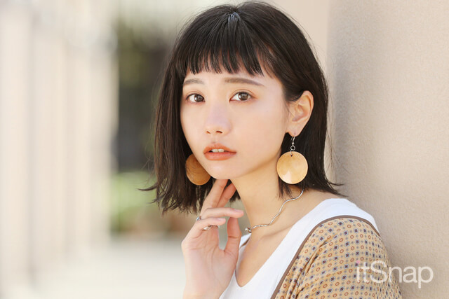 トップから中間の髪はコテでふんわりゆるめのワンカールにし、毛先の大胆な外ハネをしっかりとアピール。前髪は立ち上げるように巻き、ボブスタイルを大人っぽい印象に。顔周りと毛先にだけ、“ぬれ髪ジャム”をもみ込みながら耳かけに。濡れたような束感で今年らしく。