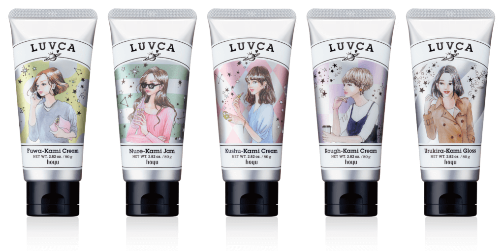 [左から]LUVCA(ラブカ) ふわ髪クリーム、ぬれ髪ジャム、くしゅ髪クリーム、ラフ髪クリーム、うるキラ髪グロス 各¥1,300(税抜)