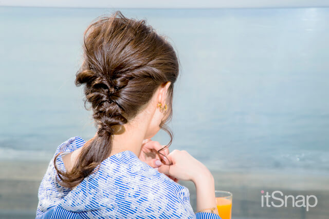 全体を26mmのコテで外巻きにしたら、表面にだけ波巻きをプラスして立体感を出しておくのがポイント。“ビーチ髪ゼリーミスト”を全体にかけたら、顔周りの髪を残してハチ上でポニーテールに。顔周りの髪は上下2段に分け、それぞれ後ろでくるりんぱにし、毛先をまとめてゴムで結んで。おくれ毛は巻いてから“ビーチ髪ゼリーミスト”をかけ、夏らしい束感と動きを演出。