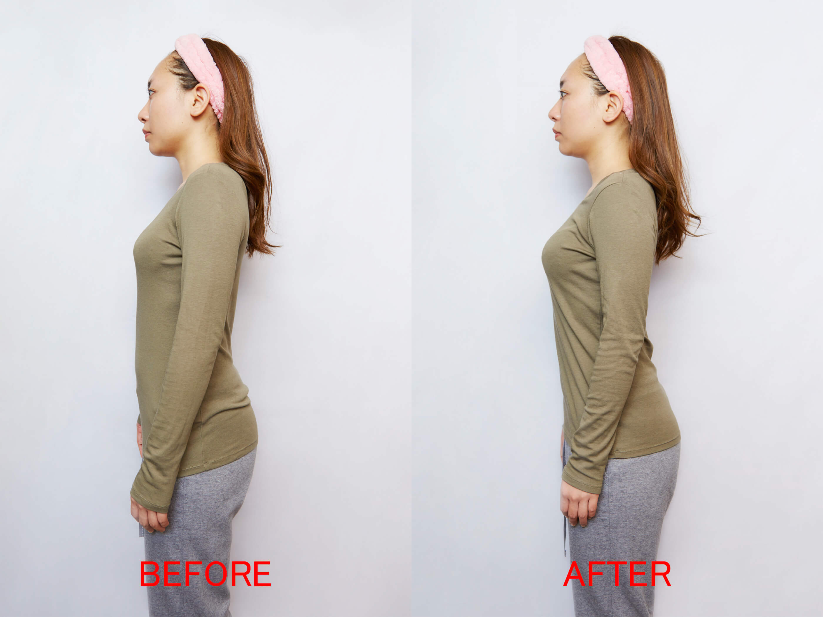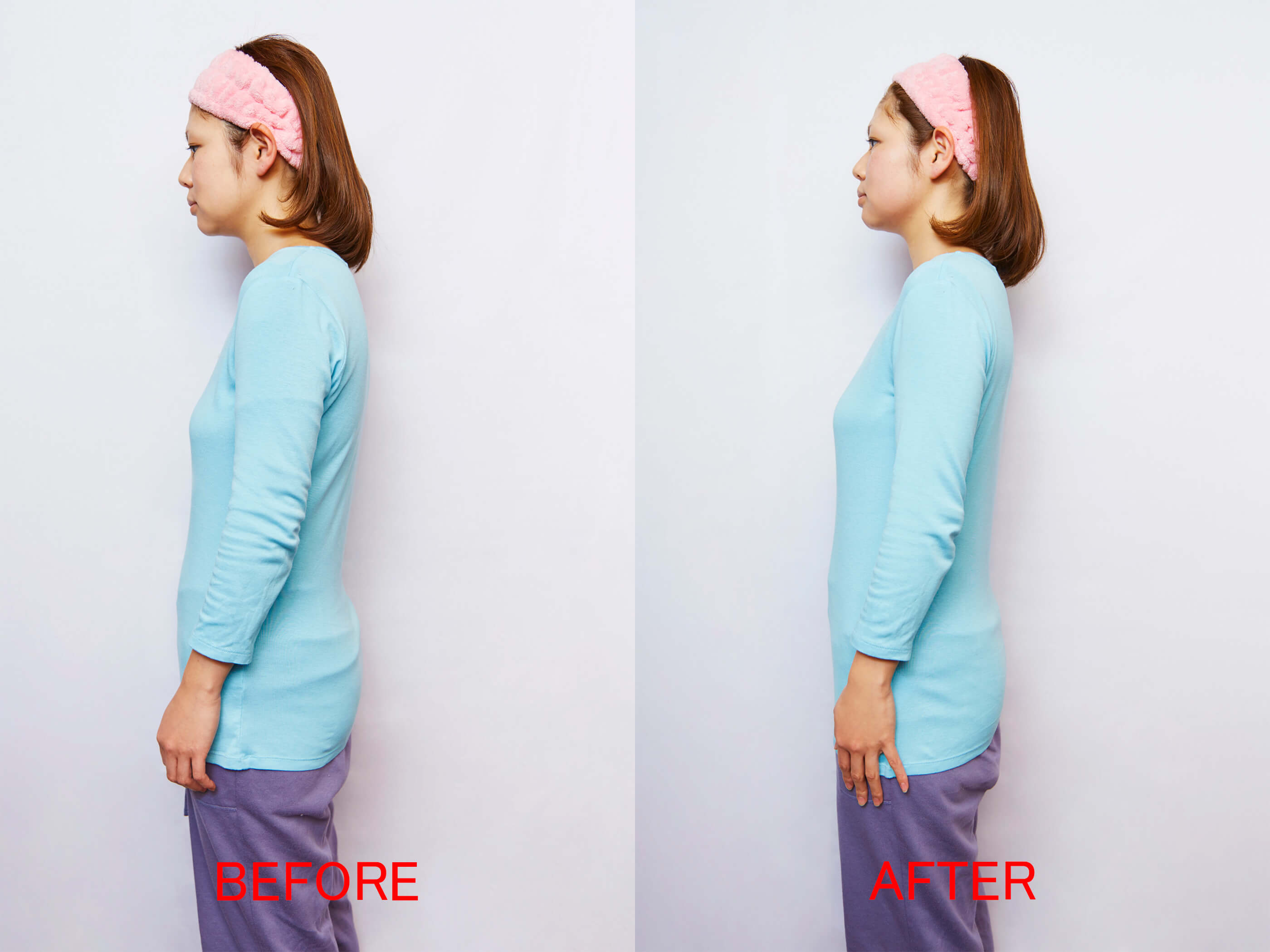 猫背はそれほど目立ちませんが、大きく反ってカーブしていた腰のラインや、首のラインが改善されているのがわかります。