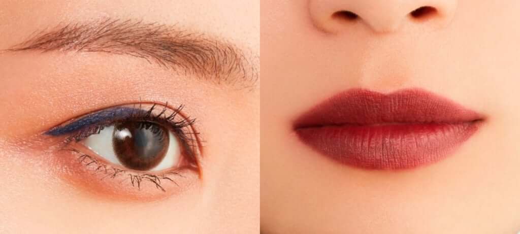 目もとは、ベージュのシャドウにブルーのアイラインで、コントラストを効かせた仕上がりに。口もとは秋冬らしいダークトーンでちょっぴりモードに寄せて。ピリッとスパイスをきかせた、周りと差のつくカラーメイクに挑戦♡