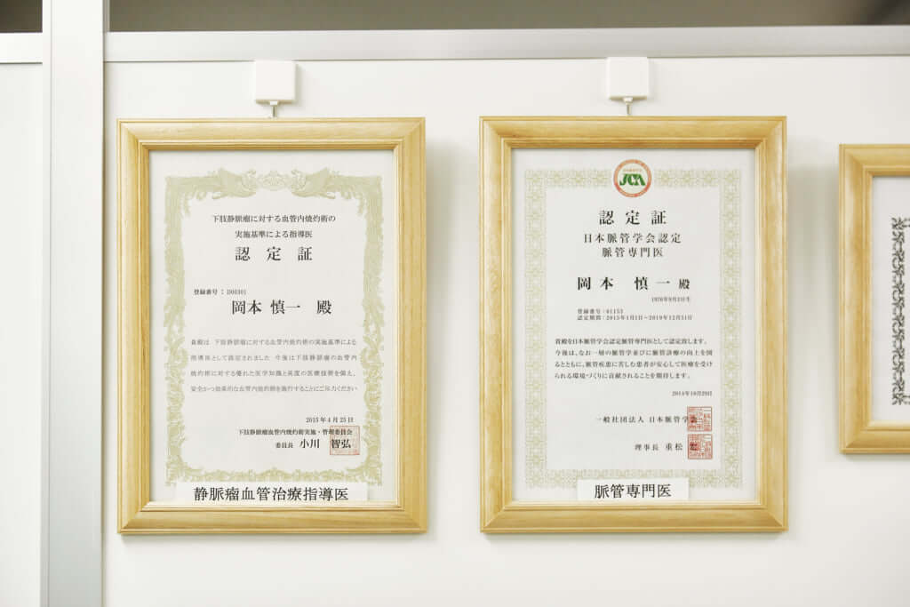 日本脈管学会が認定する脈管専門医というだけでなく、下肢静脈瘤の血管内焼灼術指導医としても認定されている岡本先生。お医者さんを指導する立場だそうで、下肢静脈瘤の「血管内治療」の腕前はピカイチです!