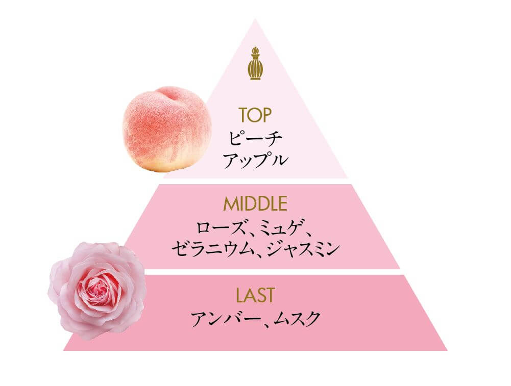 香りは、フレッシュなピーチに透明感のあるミュゲやゼラニウムを重ね、華やかでラブリーな気分を楽しめるようになっています。男女問わず人気のあるローズやピーチ、ゼラニウムがベースとなり、ふんわりと香るので、気になるあの人からも「なんだかいい香りがするね!」と褒められちゃうかも♪