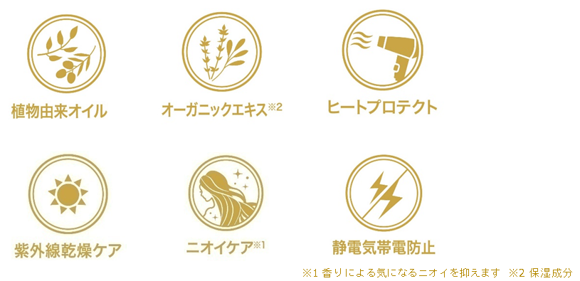 マカデミア種子油、ホホバ種子油、オリーブ果実油、ゼラニウム油*、イランイラン油の5種類のオイルが、パーマやカラーで傷んだ髪にうるおいを与えてなめらかで艶のある髪に導きます。(*ニオイテンジクアオイ油)