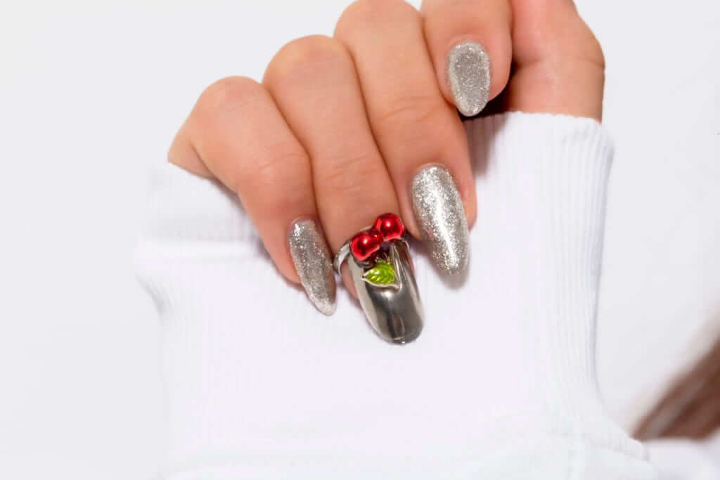 カジュアルな雰囲気が今っぽいBershkaのロゴスウェットには、女の子らしくてキュートな チェリーのネイルリングを合わせて。可愛らしさが際立つ、ぷくっと立体感のあるチェリーに視線が集まるはず♡