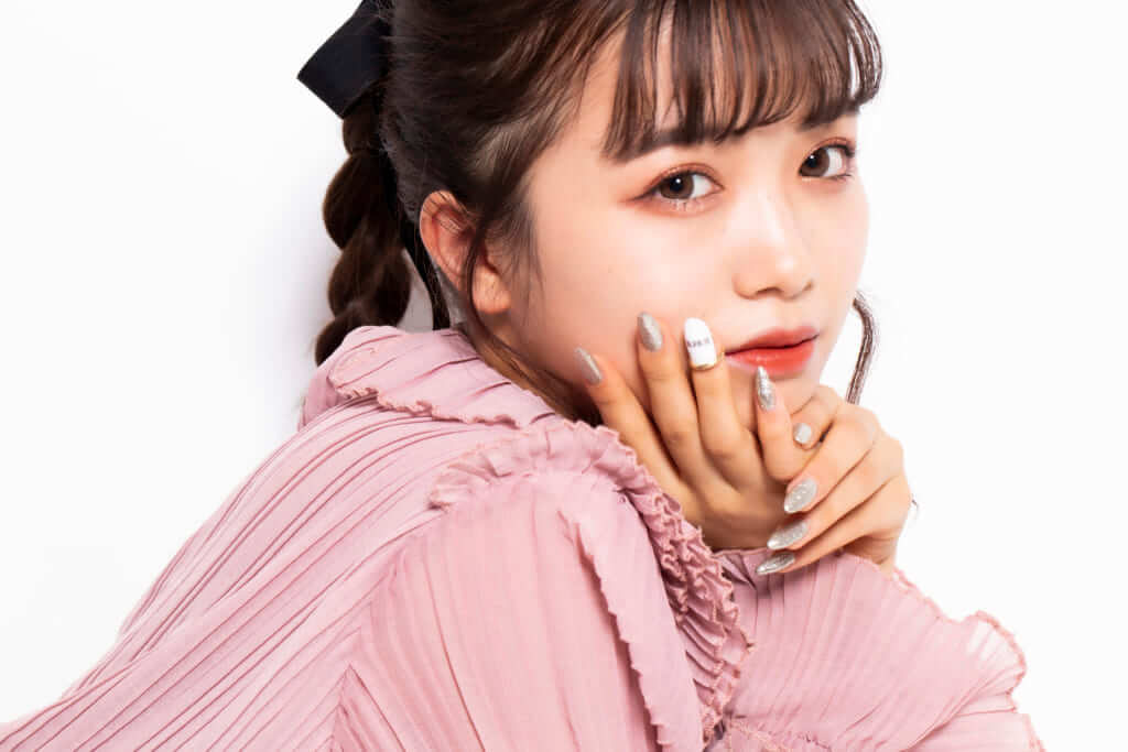 繊細なプリーツとフリルが魅力のピンクブラウスには、あえてストリート感のある文字入りネイルリングを合わせて抜け感を☆ 洋服が甘めの時は、小物を辛口にすることでバランスを取るのが◎。