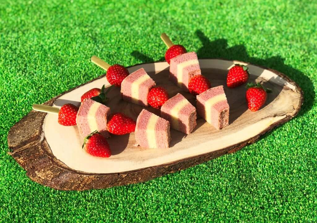 「伊豆いちごFACTORY」の「いちごバーム串」は、紅ほっぺいちごといちごチョコレートをコーティングしたしっとりふわふわなバームクーヘンを挟んだメニュー。ボリューミーな見た目なのでSNS映えもバッチリ♡ 食べ歩きしながらイベントを満喫するのもオススメです!