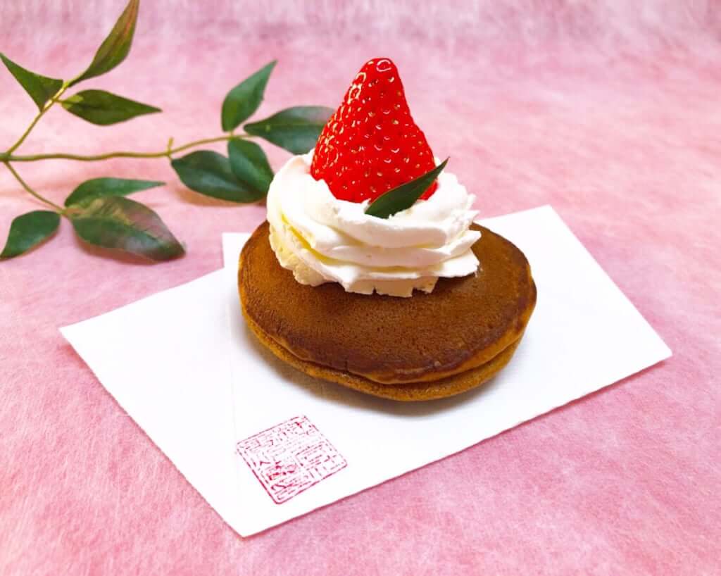 「横浜元町 香炉庵」の「いちごの生どらやき」は、人気商品の黒糖どらやきに「いちご」を添えた限定商品。なかにいちごを挟むのではなく、ショートケーキのように丸ごといちごが乗っかったのがポイント♪ 和菓子とのハーモニーをお試しあれ!