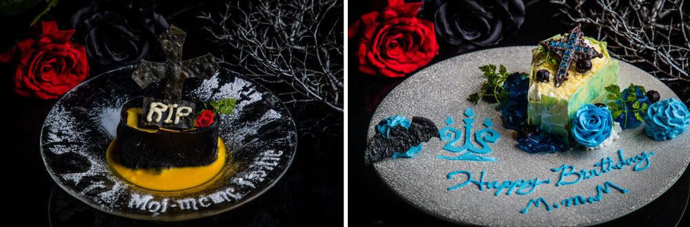 「赤い月と薔薇の花嫁たちの美しき墓標〜茄子とボロネーゼのラザニアクリーミーズッカソース〜」 1,560円(税抜)、「白亜に佇む青薔薇と煌めく古城の亡霊〜ブルーベリーとホワイトチョコレートのショートケーキ〜」 2,020円(税抜)