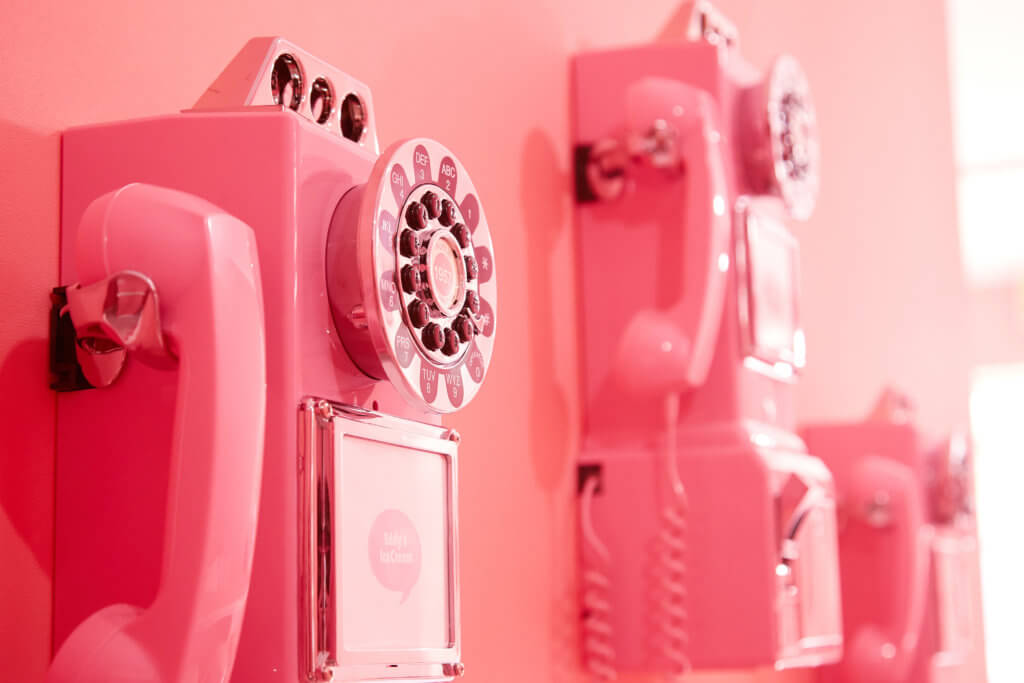 こちらはピンクの壁とピンクの電話が人気のフォトスポット! ほかにも、アイスクリームのオブジェやキュートなランプなど、隅から隅までフォトジェニックです♡