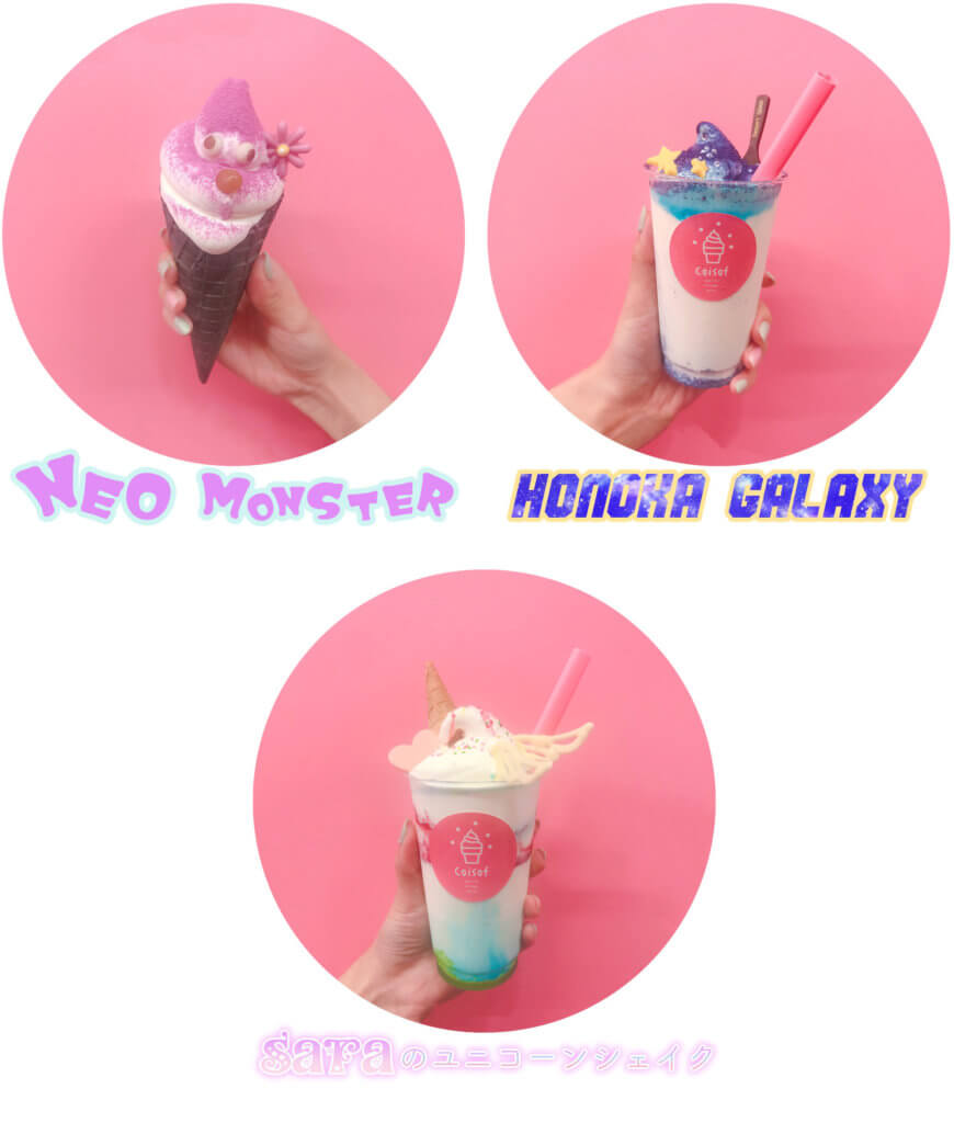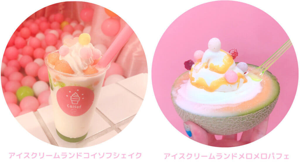「アイスクリームランドコイソフシェイク」や「メロメロパフェ」など、フォトジェニックながらもおいしいアイスはもちろん、フードやドリンクメニューが充実しています。