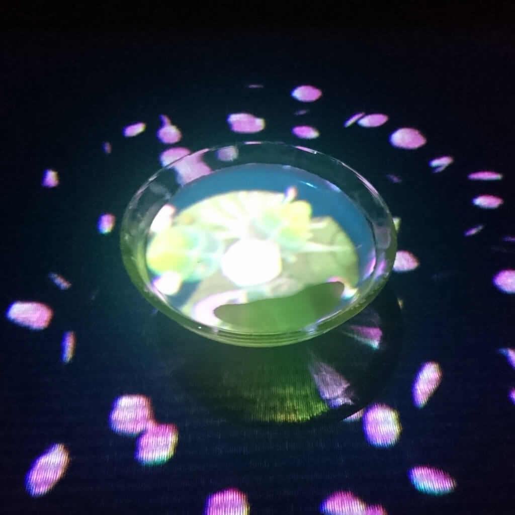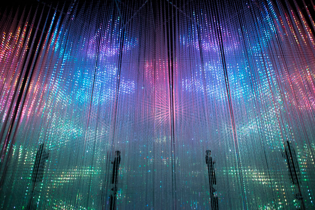 圧巻だったのは、鏡で囲われた空間にハンドメイドのヴェネチアングラスのランプが吊り下げられた「ランプの森」! ランプに手を近づけると、人に反応して一番近くのランプがカラフルに光り輝き、一筆書きのように隣のランプにどんどん伝播していきます。