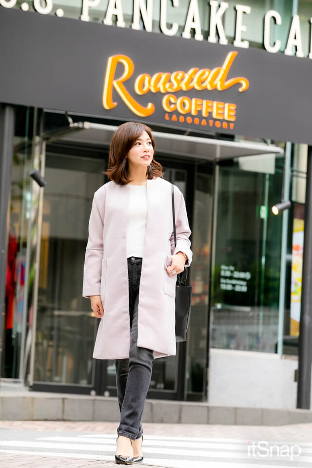 全体をモノトーンの配色でスッキリとまとめた、いい女度高めのコーデ♡ アイボリーのノーカラーコートは、羽織るだけで美人に見える“岡部あゆみコラボ”アイテム。5000円台で手に入るのに上品でサマになるので、これからのシーズンに大活躍しそう! 中に合わせたハイネックのトップスとニーハイブーツ、バッグをブラックで統一してこなれ感を出して♪