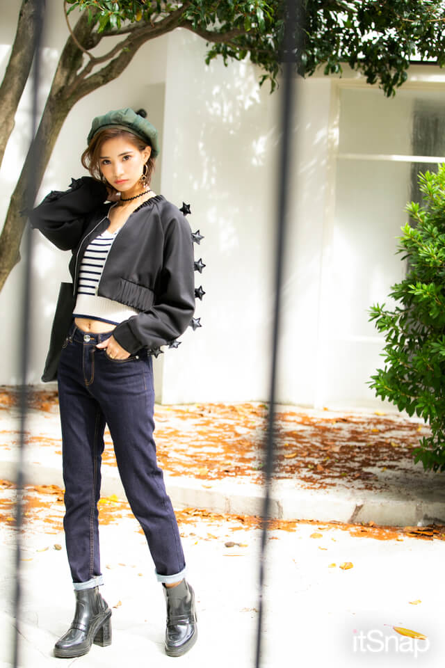 メンズライクなコーディネートを、鎖骨、ヘソ、足首と女性らしい部分をチラ見せすることで抜け感ある着こなしに。アウターに合わせたブルゾンはソデ部分に星が付いていて遊び心が目を引くデザイン♪ ロックなテイストや、メンズライクなアイテムを多く取り入れるときは、パンツのスソをロールアップしたり、中に合わせるトップスのサイズ感にこだわって女性らしさを意識してみるとGOOD。
