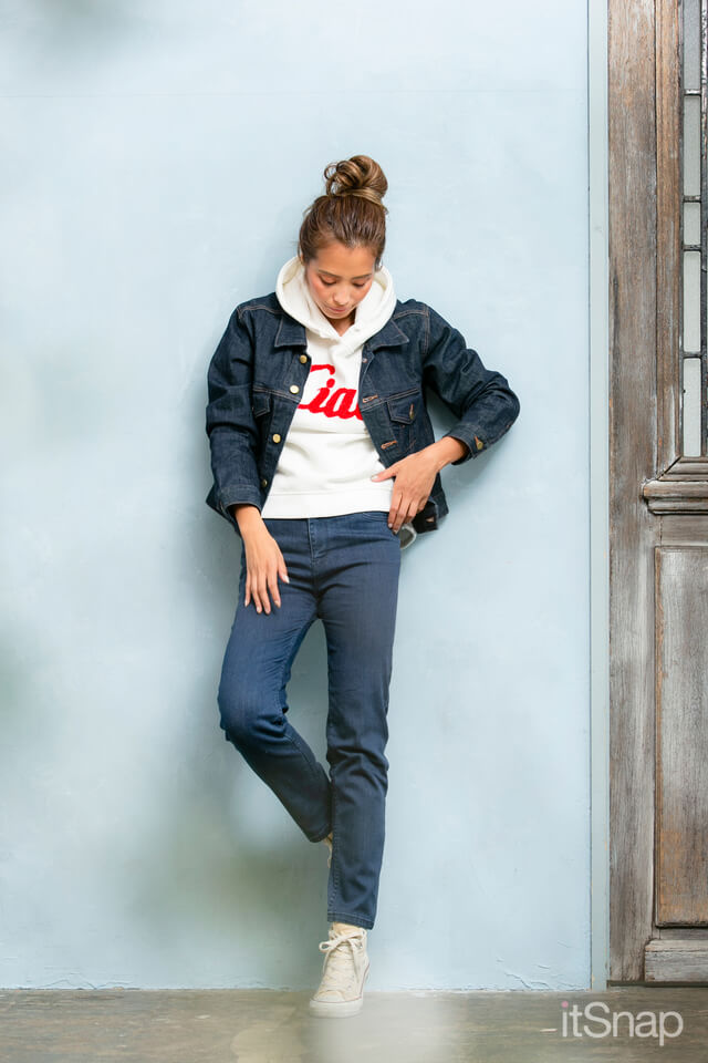 秋冬に大流行中のスウェットパーカに“岡部あゆみコラボ”デニムを合わせてとことんカジュアルに。このデニムは、腰回りに余裕があり、ほどよくストレートなラインが穿き心地のよさと美シルエットの両方を叶えてくれます♡ アウターにはジャストサイズのデニムジャケットをセレクトして、デニムラブな海外セレブを気取ってみて。