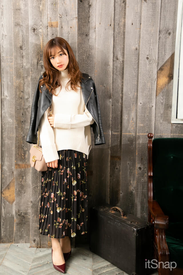 ゆったりとしたアイボリーのニット×ロング丈の花柄スカートでリラックス感あるコーデに、ライダースジャケットを合わせて辛さをプラス。足元もボルドーのポインテッドトゥパンプスで大人っぽく仕上げて、甘さと辛さのバランスを絶妙にキープ。“岡部あゆみコラボ”のニットは着ぶくれせず、ゆとりのあるハイネックで小顔効果も♪