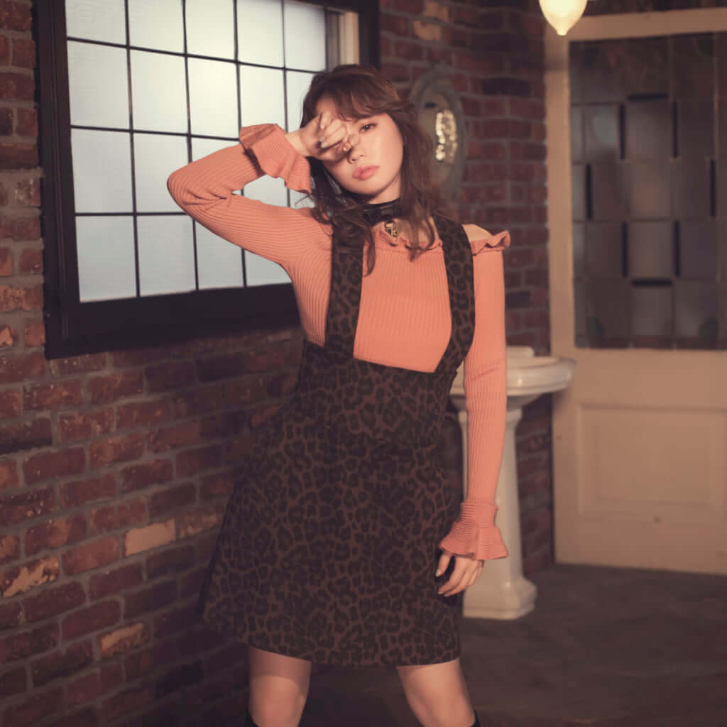 ピンクベージュのヒョウ柄で程よく甘さをプラスしつつスタッズでしっかり辛口に。