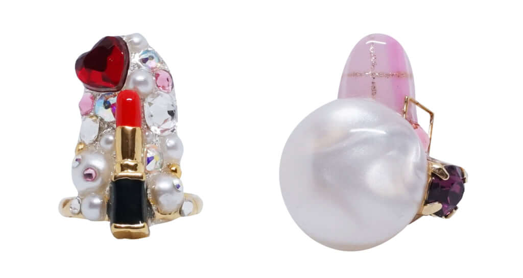 リップスティックのモチーフとパールが贅沢にデコレーションされた遊び心たっぷりのリングでコーデにアクセント(上)。ピュア感あふれるドーリーなコーデに大きなパール付きリングで視線をひとり占め(下)。