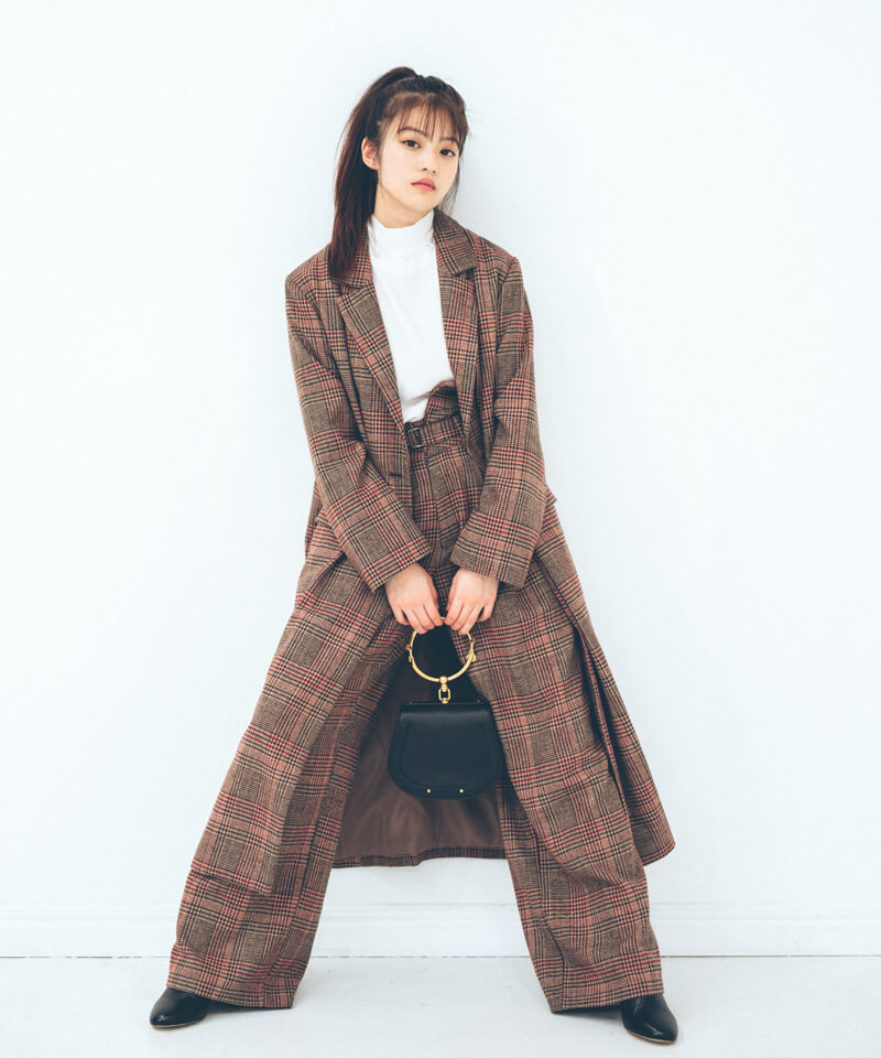 なかでも注目なのが、ロングコート。サイドに入ったスリットがポイントのロングコートは、丈の長さやボタン、柄選びにもこだわりが。すっきりとしたシルエットで、マニッシュな中にも女性らしいデザインです。同じ素材のワイドパンツと合わせてセットアップにするのがおすすめ! カラーはベージュ、ブラウン、ブラックの3色。