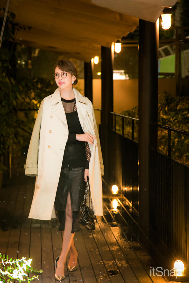 トレンチを使ったきれいめなコーデを、透けレーストップス×スリット入りレザースカートの技ありアイテムチョイスで、ちょっぴりモードな着こなしに! アクセントにメガネをプラスし、インテリジェンス×セクシーを感じさせるスタイリッシュさで年上彼氏の心を刺激して♡