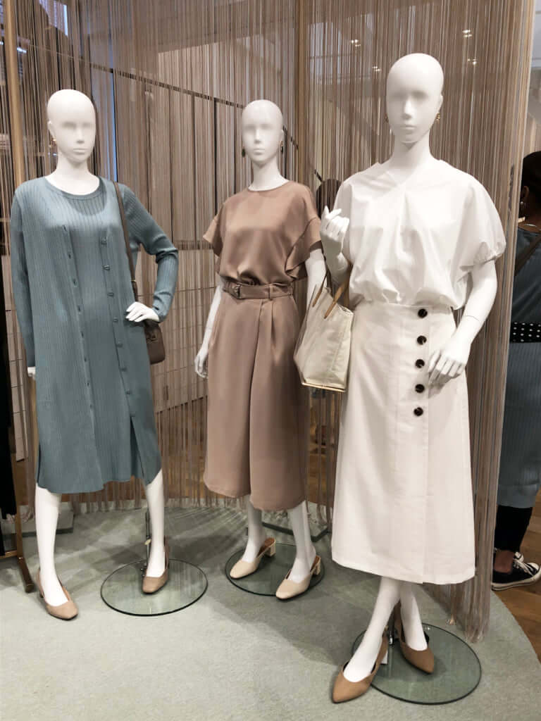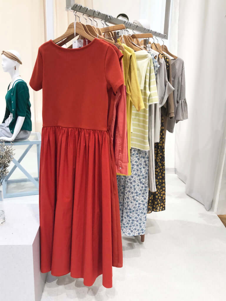 カットソーとコットンスカートのドッキングされたデザインのワンピースもお目見え。くすみ系の大人っぽいカラーとしっかりした素材で夏だけでなく秋口まで着倒せます♡