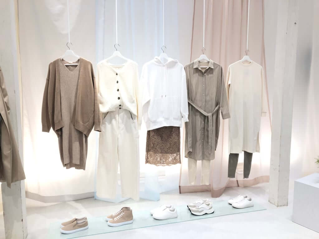 こちらは春夏イチオシのホワイトやベージュのワントーンが優しげなコーデ。コーデの中に登場するリブワイドパンツ、リブレギンスはリッラクスとトレンドを両立する注目アイテム。適度な厚みがボディラインをひろいにくいため、体型を選ばずに着ることができます。